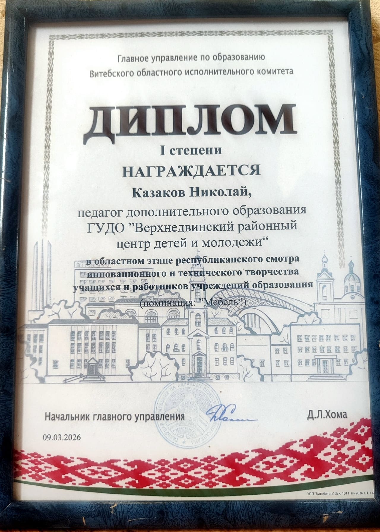 Поздравляем Казакова Николая Владимировича, педагога дополнительного образования Верхнедвинского районного центра детей и молодежи, с Дипломом I степени в областном этапе республиканского смотра инновационного и технического творчества учащихся и работников учреждений образования в номинации «Мебель» (экспонат «Кресло»).